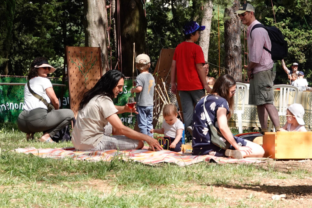 Marche sur sangle entre les arbres : démonstration et échanges avec les pratiquants.